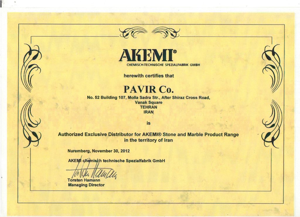 گروه بازرگانی پاویر تجارت ایرانیان نمایندگی انحصاری شرکت AKEMI آلمان و شرکت KLINDEX ایتالیا در ایران میباشد. لذا جهت امور اجرایی و تکنیکی خود از مواد AKEMI آلمان و ماشین آلات KLINDEX ایتالیا بر اساس استاندارد های روز اروپا ، با ضمانت اصالت ، خدمات خود را ارائه می دهد.